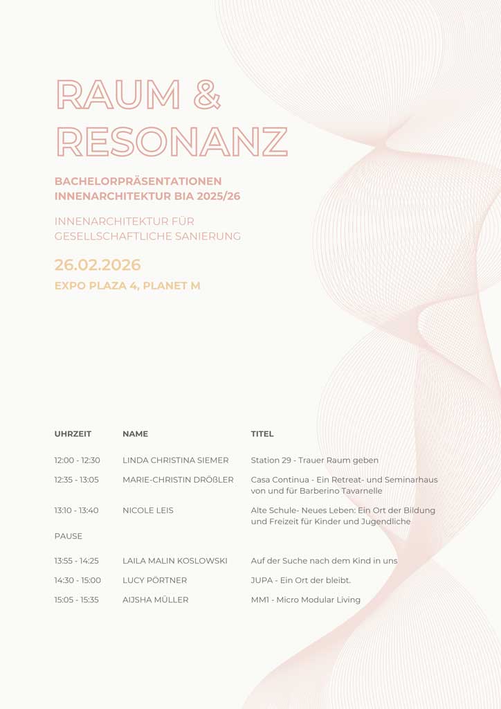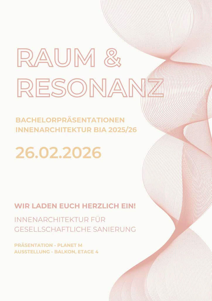 Der Studiengang Innenarchitektur lädt herzlich zu den Bachelorpräsentationen ein. Am 26. Februar 2026 stellen sechs Absolventinnen des Wintersemesters 2025/26 ihre Abschlussarbeiten im Planet M vor. Alle Bachelorarbeiten sind in der Ausstellung „RAUM & RESONANZ – INNENARCHITEKTUR FÜR GESELLSCHAFTLICHE SANIERUNG“ auf dem 4. Balkon der Expo Plaza 2 zu sehen.