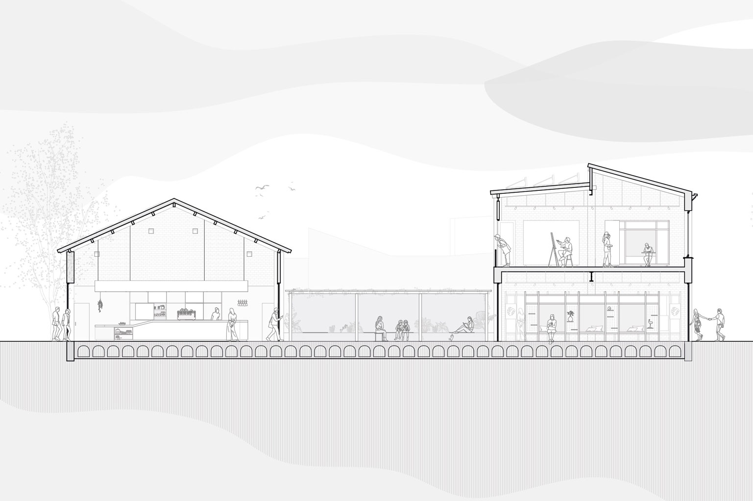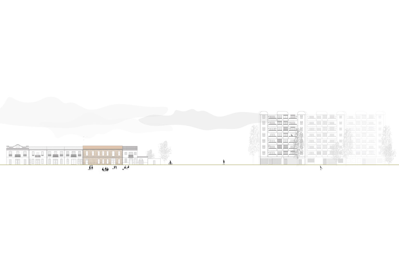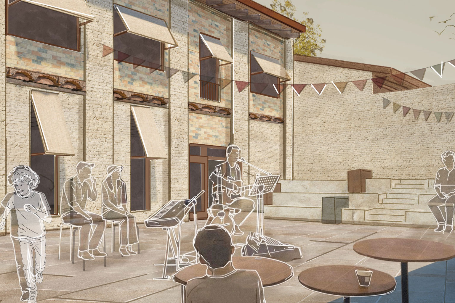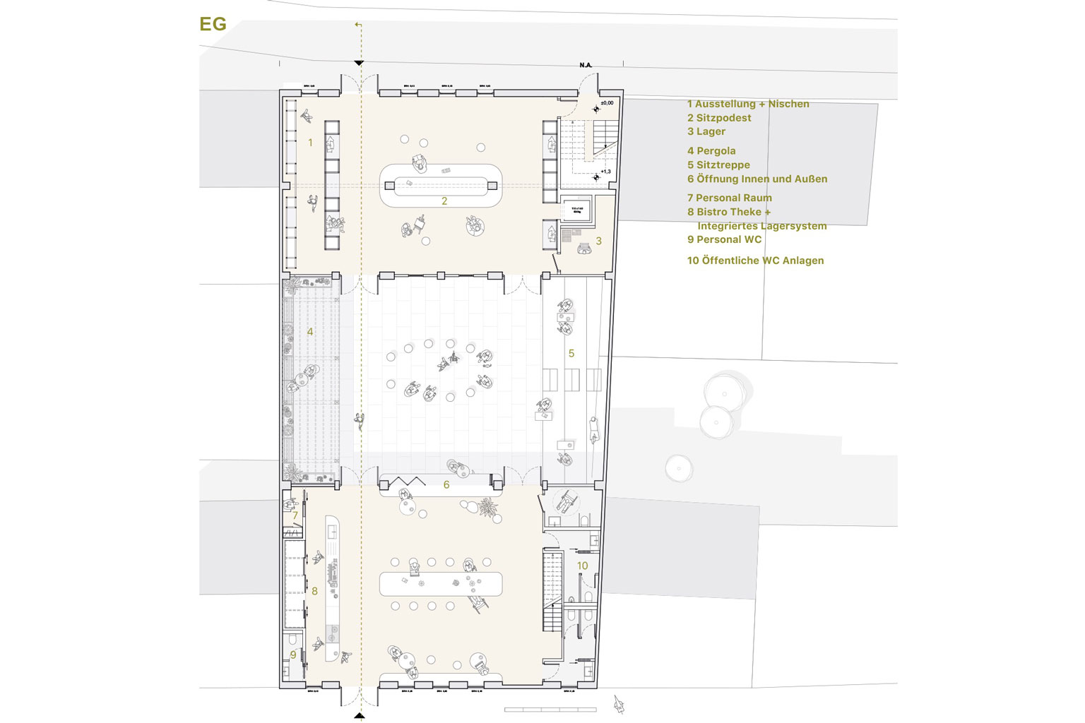 Ziel ist die Schaffung eines sozialen Schwellenraums, der Begegnung, Aufenthalt und informellen Austausch ermöglicht, ohne feste Nutzungen vorzugeben. Der Entwurf versteht den dritten Ort als offenen, niedrigschwelligen Sozialraum, der sich durch Aneignung und Alltag entwickelt. Der architektonische Fokus liegt auf Offenheit, Flexibilität und Blickbeziehungen als räumliche Mittel zur Förderung von Begegnung.