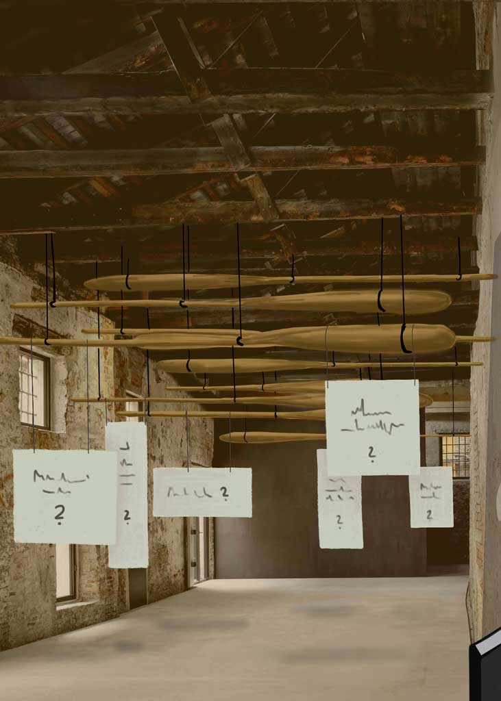 Die Räume teilen sich in Tradition und Zukunft. Muranoglas steht für die lange Geschichte der venezianischen Handwerkskunst. Gleichzeitig markiert die Installation einen Wendepunk: Die Tradition bleibt wichtig, doch es öffnet sich der Blick für Neues. Veränderte Arbeitsweisen ermöglichen insbesondere Fraueneine prägende Rolle im Handwerk zu übernehmen und die Zukunft zu gestalten. Sie bewahren den wertvollen Kern ihrer Kultur, während sie gleichzeitig Raum für Veränderung schaffen. Die geschieht durch selektive Modernisierung, bei der traditionelle Werte in neue Kontexte übertragen werden.