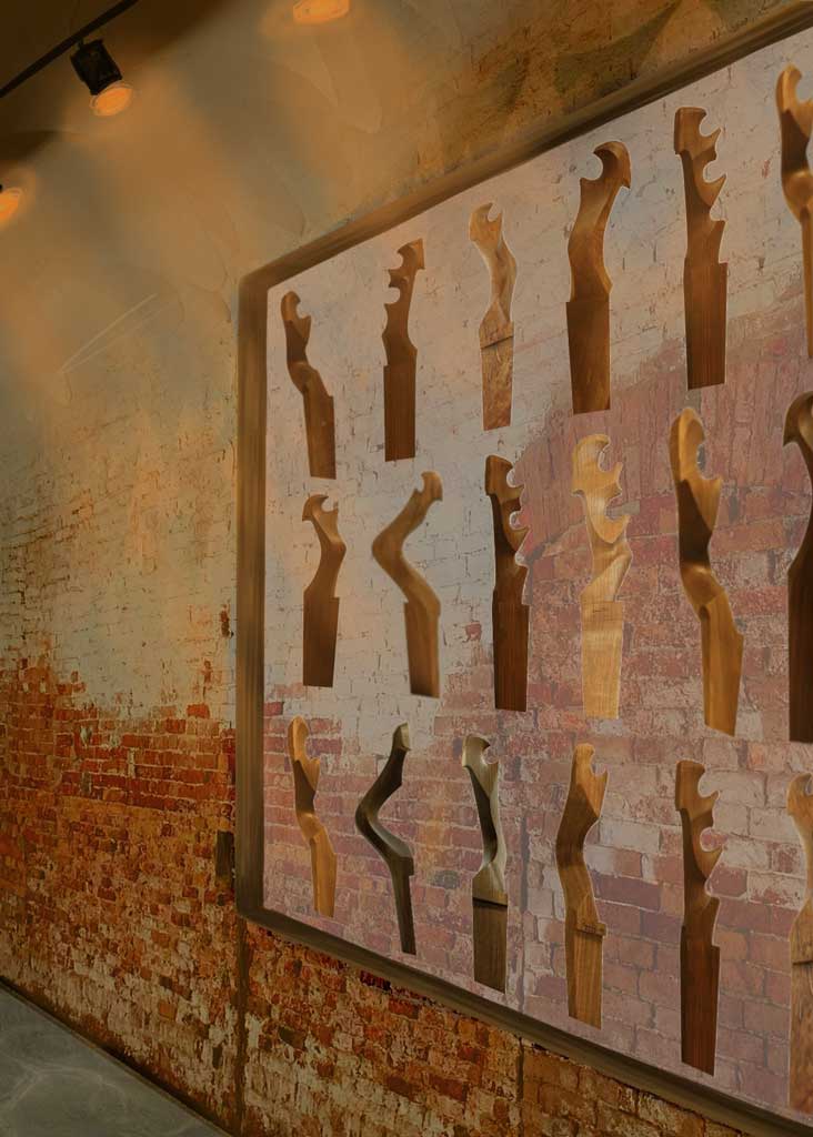 Mit dunklen und warmen Akzenten sowie Projektionen von Wasserbewegung entsteht ein Raum, der sowohl die Materialität des Holzes betont als auch die Bewegung und Eleganz des Handwerks spürbar macht.