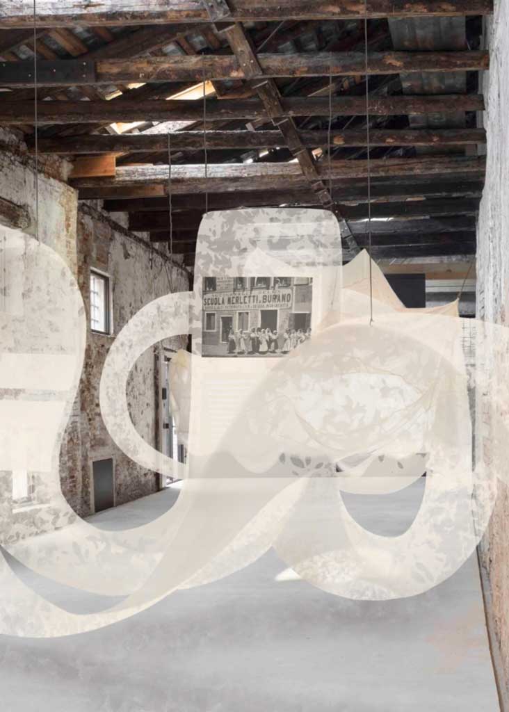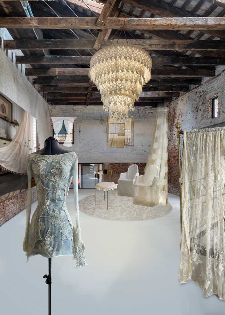 Die Spitze wird als direktes Gestaltungselement verwendet, das die Ausstellung optisch ansprechend macht und so einen bleibenden Eindruck hinterlässt. Durch die großflächige Installation im Raum wird der/die Besuchende selbst Teil der Ausstellung. Dass es sich hierbei jedoch um einfache Bahnenware handelt, klärt sich erst gegen Ende. Hier wird vor Augen geführt, wie wenig in der Regel auf Details geachtet wird und im direkten Vergleich die Komplexität der Burano-Muster verdeutlicht. In Kombination mit dem anschließenden Ausstellen moderner Spitzen-Exponate soll das Material die verdiente Anerkennung erhalten und in ein neuzeitliches Licht gerückt werden.