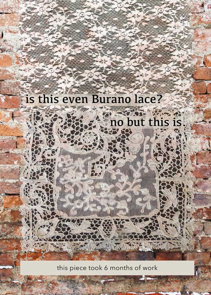 In ihrem Kurzprojekt rückte Bentje Andresen das traditionelle Kunsthandwerk der Burano-Spitze in den Mittelpunkt der Ausstellung. Das Aufzeigen ihrer Geschichte und der zeitaufwändigen Herstellung stärkt die Wertschätzung dieser einzigartigen Handarbeit.